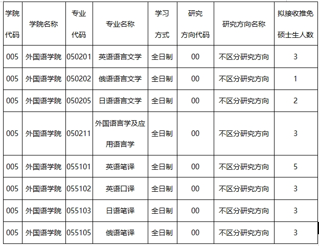 1. 拟于9月30日前开放“中国研究生招生信息网-推免服务系统”,10月20日前视工作进度关闭。系统公布的人数为拟招收推免生数,录取时视生源状况和各学科发展需要确定各专业名额,择优录取、宁缺毋滥,实际录取人数以国家录检系统确认为准。符合条件的拟申请者须登录系统提交申请,并将申请材料电子版发送至我院指定电子邮箱(邮箱:waiguoyuxueyuanyjs@126.com,邮件主题“姓名+申请专业及方向”,申请材料以压缩文件夹形式上传)。