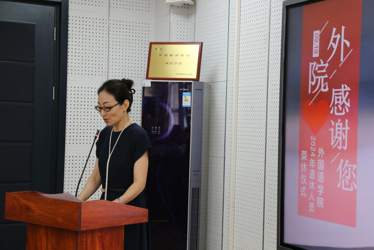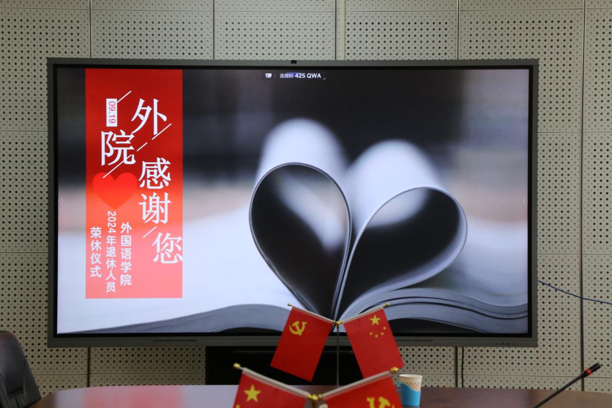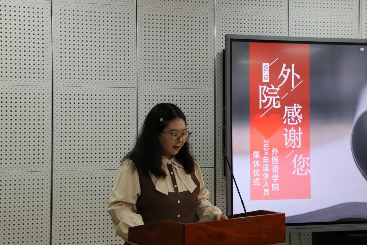 仪式开始,李满亮院长对五位退休教师为学院发展、外语学科建设作出的重要贡献表示感谢。同时指出,荣休仪式不仅是对退休教师多年付出的认可,也是一种文化传承,是对荣休教师高尚品格和宝贵经验的大力弘扬和传承。学院党委书记李国珍宣读了学院2024年荣休人员名单。