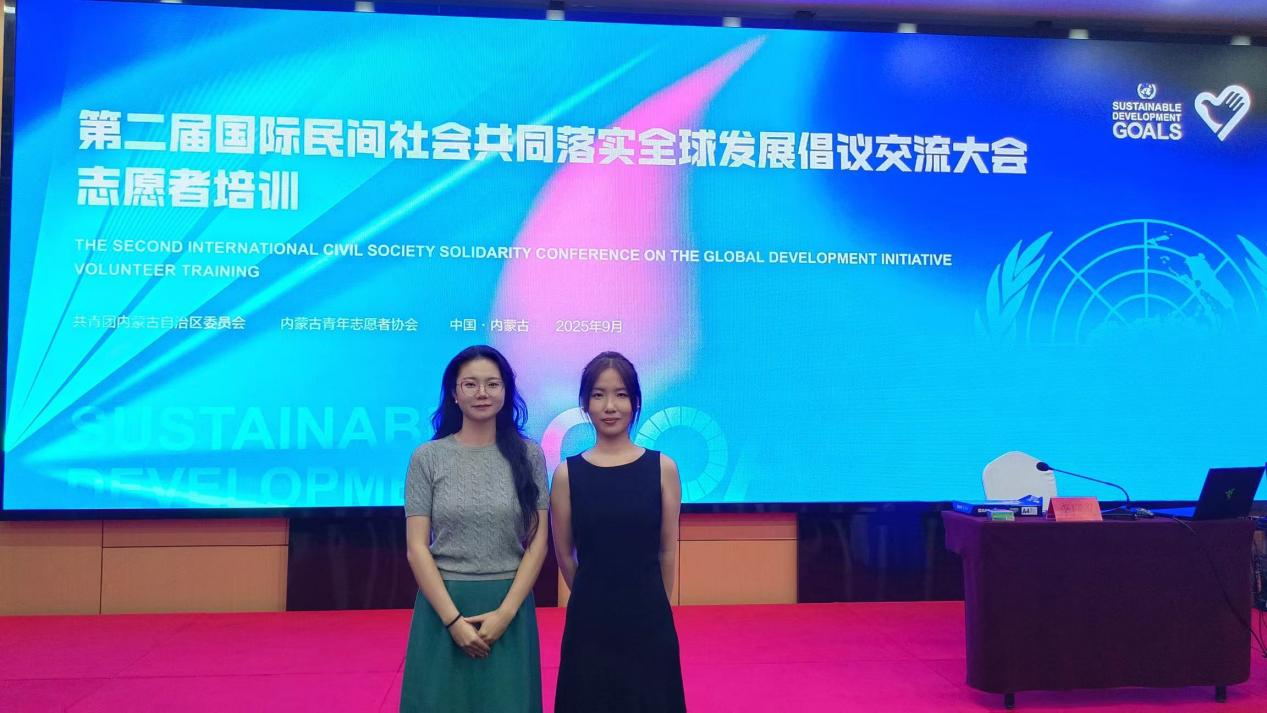 2025年9月,第二届国际民间社会共同落实全球发展倡议交流大会在呼和浩特举行。学院选派了16名学生志愿者及2名教师志愿者参与到本次国际志愿服务工作中,会议期间,我院师生深度参与大会服务工作,为非物质文化遗产展示活动、开幕式、小型那达慕特色文化活动、务实合作促发展对接会及理念交流会等多项议程提供了专业、高效的翻译服务。大学外语教学部李雪萌、王梦雨作为领队教师,凭借扎实的专业能力,承担关键随行翻译任务,保障外宾行程顺利衔接。会议期间,我院志愿者以娴熟的外语能力、细致的服务态度和良好的跨文化沟通素养,生动展现了“奉献、友爱、互助、进步”的志愿服务理念,成为大会期间一抹温暖而充满活力的青春风景。