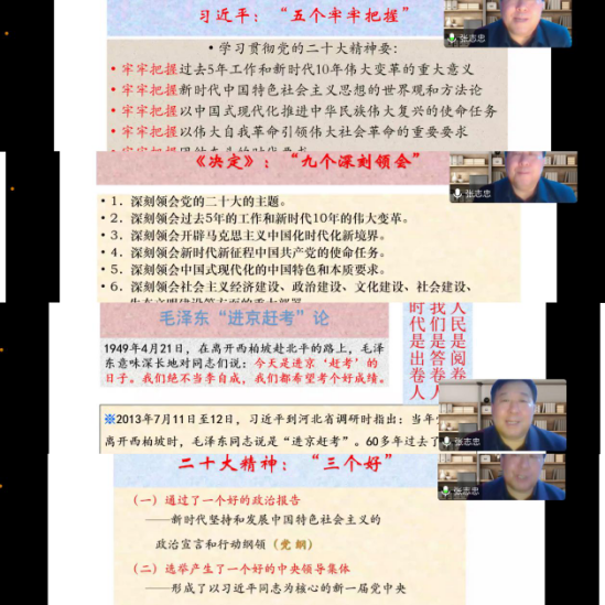 张教授认为,想要更准确地把握二十大精神,就必须理解二十大精神的逻辑思路和核心要义,张教授深入浅出,以独特的视角为各位教师讲解了此项内容,帮助大家更好地理解了中国共产党为什么“能”、马克思主义为什么“行”、中国特色社会主义为什么“好”。在展开的讲解中,张志忠教授以详实的案例更好地帮助大家理解二十大精神,如毛泽东的“进京赶考”论、“民主新路”跳出历史周期率、习近平的“自我革命”跳出历史周期率等。