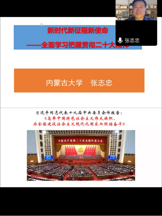 此次宣讲的主题为《新时代新征程新使命——全面学习把握贯彻二十大精神》,在本场宣讲中,张志忠教授结合党的二十大报告,从二十大召开的时代背景和重大意义、全面准确学习领会二十大精神的“三个好”、深入贯彻新时代新征程的使命任务和战略部署、全面从严治党和开展反腐败斗争等角度进行了详细阐述。