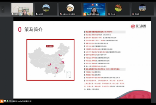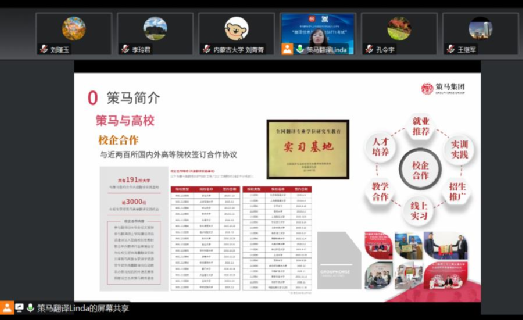 刘瑾玉副院长简要介绍了学院在研究生培养方面的师资队伍、科学研究、人才培养、学位论文、实习实践及就业等方面的具体情况,从学生实习实践、师资培训等方面强调了校企合作的重要性和必要性。随后,策马副总经理张丽女士详细介绍了策马翻译的历史沿革、业务范围、人力资源及翻译项目,希望与tyc539太阳大力合作,实现互利共赢。英语、日语和俄语系教研室负责人分别就多语种实践、国际教育合作、合作搭建学术会议与大赛进行了深入的讨论。最后,双方就合作领域、合作模式、合作机制等方面达成一致,并就下一步校企合作项目落地达成共识。