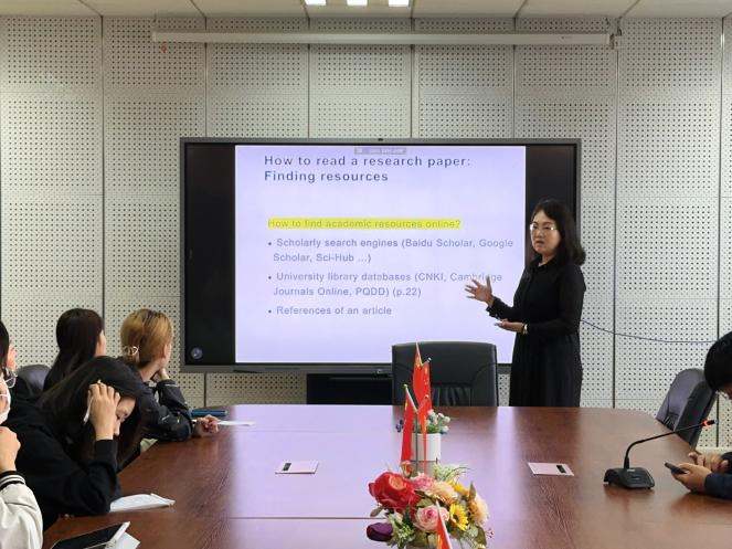 阿荣娜老师依次为同学们介绍了个人读博士期间的学业历程、阅读三步法、论文撰写以及文献查阅方法。她强调,阅读量是所有学习实践的基础,同时,同学们应找到真正有兴趣的研究方向,将理论与实践相结合。