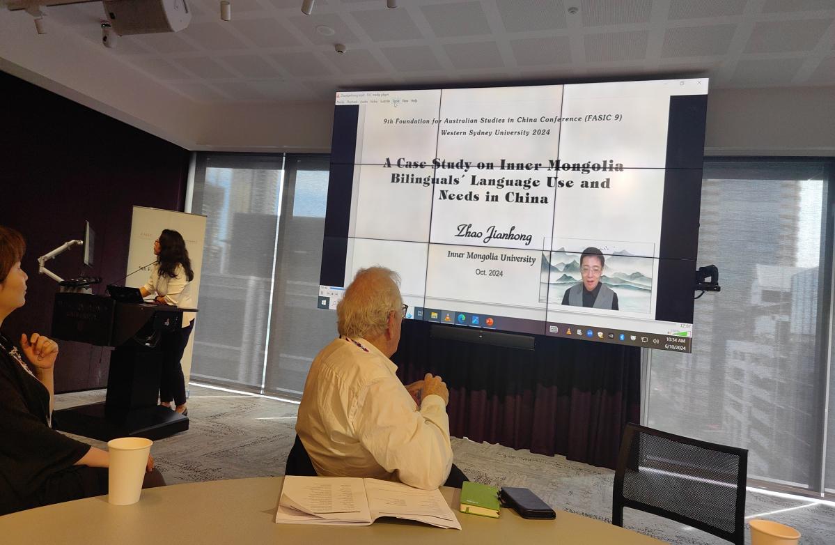 张红梅副教授在西悉尼大学现场参加了为期四天的两个研讨会,并在ACTS 10大会做了报告,题目为: A Report on the English - Chinese Translation of Jane in Love。该报告介绍了张红梅副教授翻译团队完成的一部澳大利亚文学作品Jane in Love的英译汉过程以及该译著的出版价值。赵剑宏副教授因签证通过时间晚于既定航班行程,经与组委会沟通,以线上参会方式,在FASIC 9大会做视频报告,题目为:A Case Study of Inner Mongolia Bilingual Speakers' Language Use and Needs in China,汇报了语言田野调查的研究过程与结论。二位教授的现场报告得到大会现场的热烈反馈和好评,对于在华澳大利亚研究尤其是促进tyc539太阳澳大利亚研究中心的国际影响力提升和高质量发展起到了积极作用。